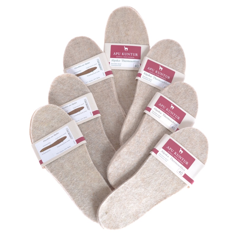 Hol dir die Wärme in den Schuh! Mit den hochwertigen und qualitativen Filz-Einlegesohlen sind kalte Füßen passé. Durch die besonderen Eigenschaften der Alpakawolle und die des daraus entstandenen Filzes hast du stets ein angenehmes Klima im Schuh. Filz ist druckelastisch und widerstandsfähig. Damit läufst du fast wie auf Wolken. Durch die gummierte Sohle haben die Sohlen einen festen Sitz im Schuh und es wird vermieden, dass sie im Schuh hin- und herrutschen bzw. unangenehme Falten entstehen.
