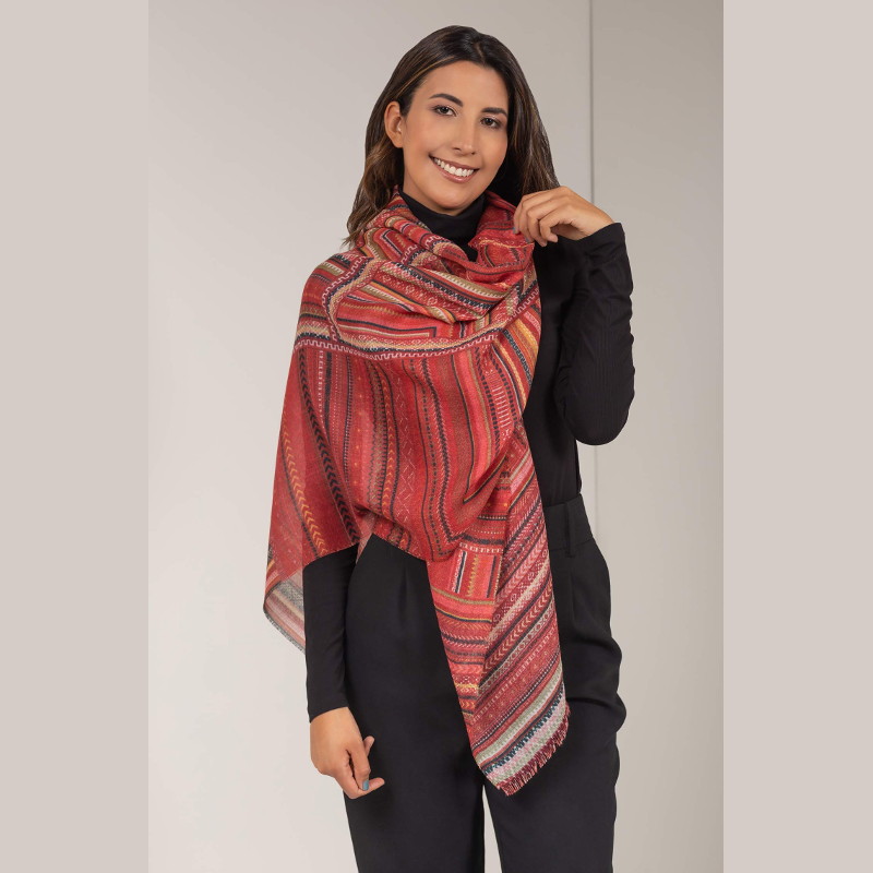 Dieser farbenfrohe leichte Schal ist ein echter Hingucker und lässt dich ein Stück Peru mit dir tragen.