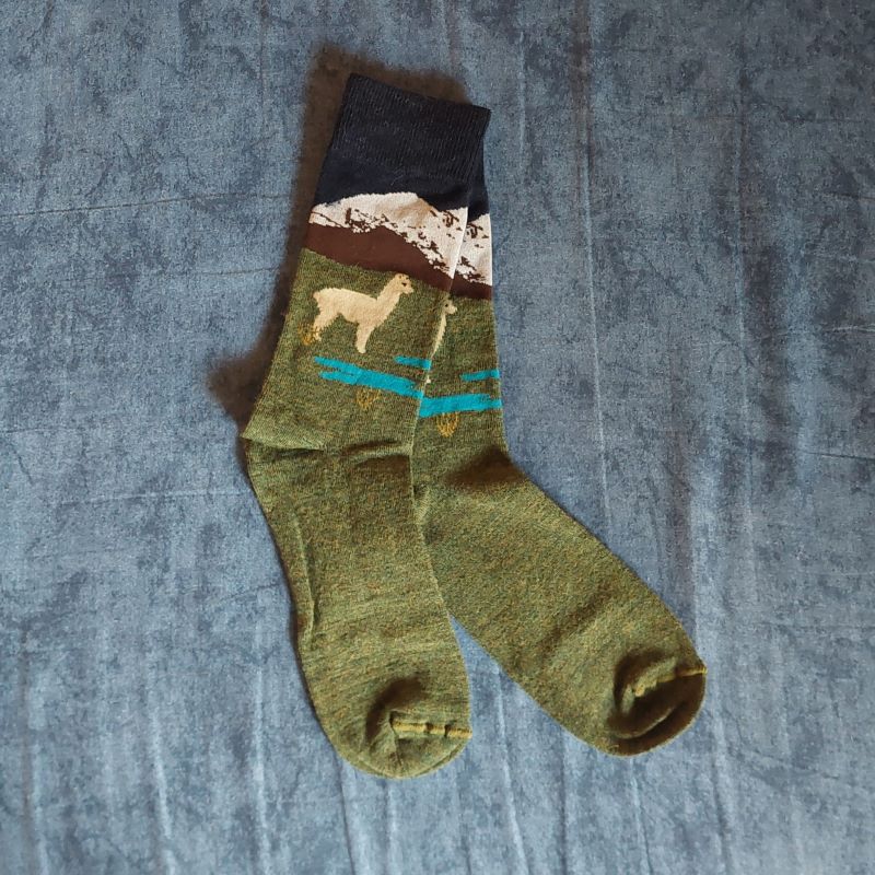 Flauscheweiche Socken mit hochwertiger Alpakawolle - dekorativ gefertigt mit einem Alpaka in der Andenlandschaft mit Berg und See.